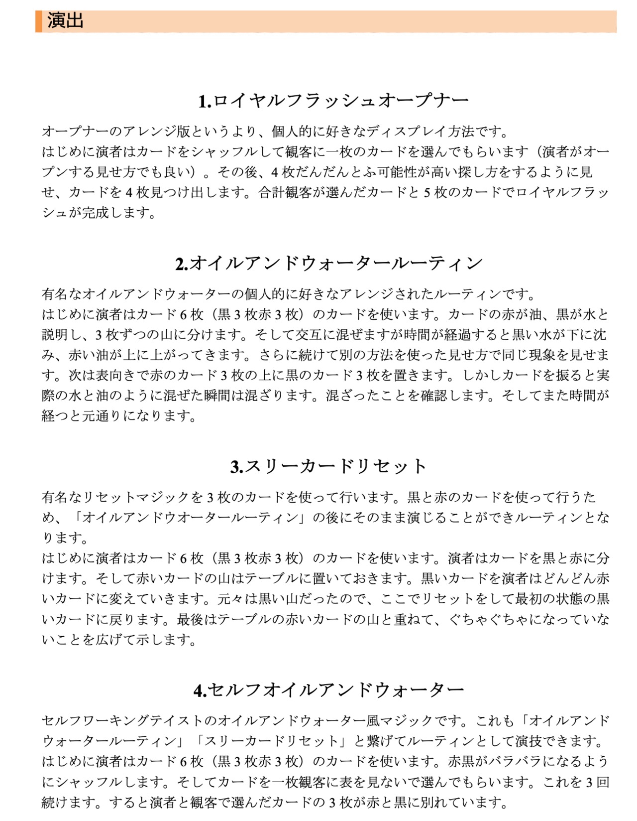 有名なオイルアンドウォーターの個人的に好きなアレンジされたルーティンです。 はじめに演者はカード 6 枚(黒 3 枚赤 3 枚)のカードを使います。カードの赤が油、黒が水と 説明し、3 枚ずつの山に分けます。そして交互に混ぜますが時間が経過すると黒い水が下に沈 み、赤い油が上に上がってきます。さらに続けて別の方法を使った見せ方で同じ現象を見せま す。次は表向きで赤のカード 3 枚の上に黒のカード 3 枚を置きます。しかしカードを振ると実 際の水と油のように混ぜた瞬間は混ざります。混ざったことを確認します。そしてまた時間が 経つと元通りになります。